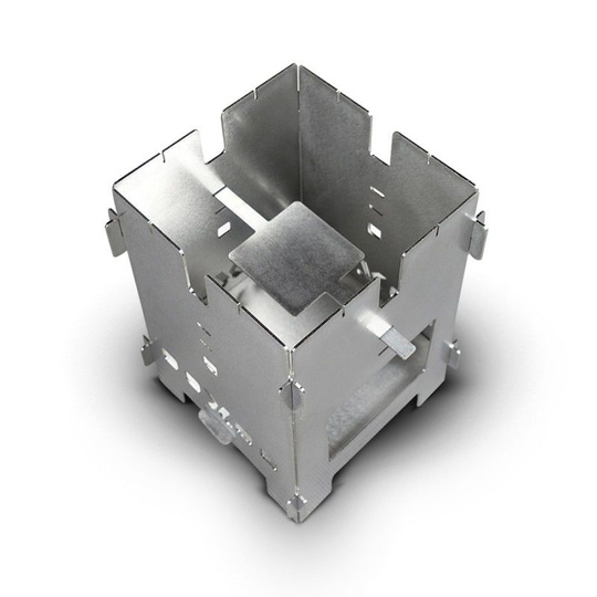 Składana kuchenka polowa ze stali. Bardzo wytrzymała, stworzona na potrzeby bushcraftu. Dwie poprzeczne blaszki pozwalają używać nawet niewielkich kubeczków. Dodatkowa blaszka wew. paleniska umożliwia wykorzystanie paliwa w postaci "tabletek". Do kuchenki dołączony jest pokrowiec z mocnej kodury.