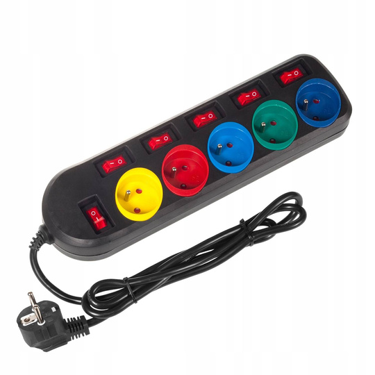 - Listwa zasilająca z 5 gniazdami, pozwala podłączyć równocześnie aż pięć pełnowymiarowych wtyczek. Posiada zabezpieczenie przed dziećmi wbudowany podświetlany włącznik sieciowy oraz osobne wyłączniki dla każdego