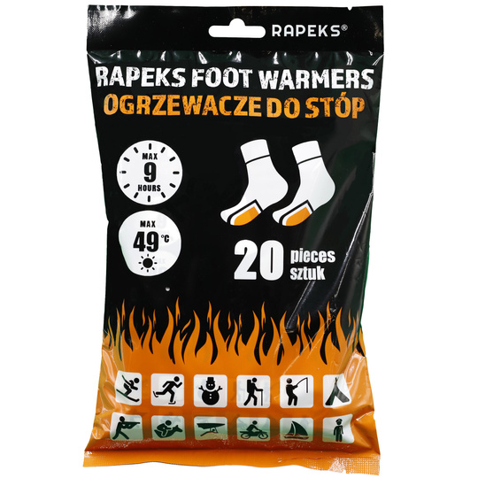 - Komplet 20 chemicznych ogrzewaczy do rąk RAPEKS FOOT WARMER ułatwią i uprzyjemnią uprawianie sportów zimowych. Jednorazowe i proste w użyciu ogrzewacze do stóp marki Rapeks zapewnią ciepło na co najmniej 9 godzin.