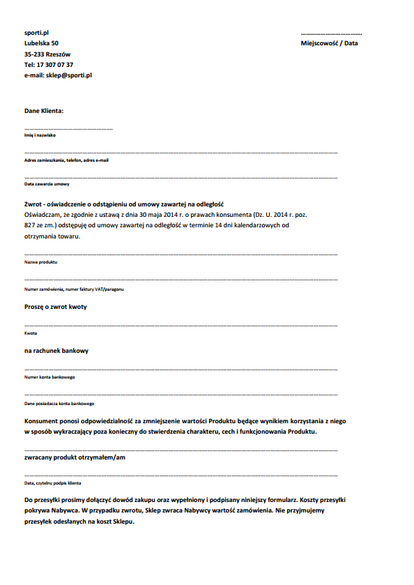Posiadając konto klienta na sporti.pl możesz wygenerować zwrot na gotowym formularzu.