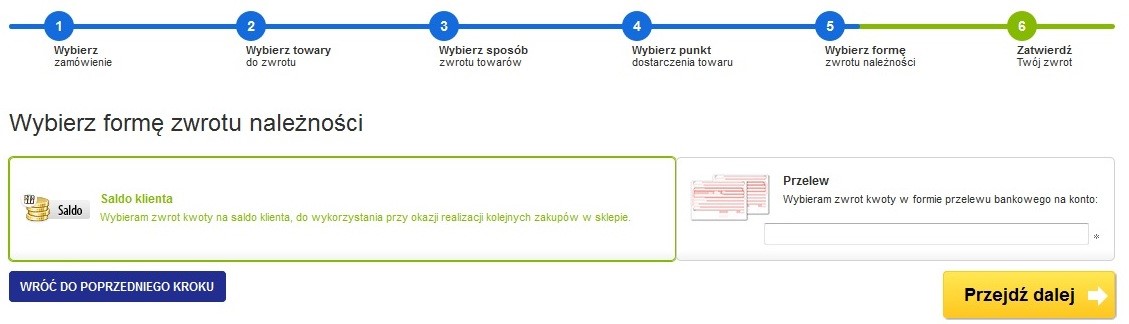 Zwrot wypłaty będzie dokonany takim samym sposobem płatności jakim została dokonana wpłata przez Ciebie podczas transakcji zakupu. Jeżeli będzie to niemożliwe to zwrot nastąpi na rachunek bankowy, tym samym prosimy o wskazanie numeru rachunku.